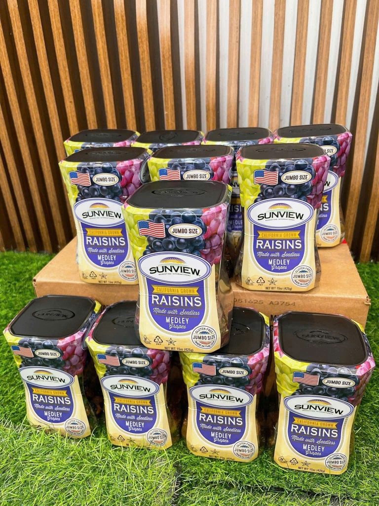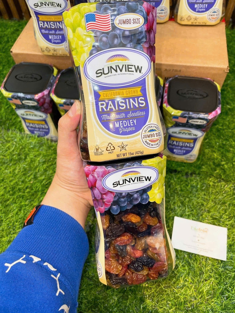 Nho khô hỗn hợp Sunview là sản phẩm nổi tiếng toàn cầu, được tuyển chọn từ những giống nho chất lượng cao của Mỹ, sấy khô tự nhiên, giữ trọn hương vị và giá trị dinh dưỡng.